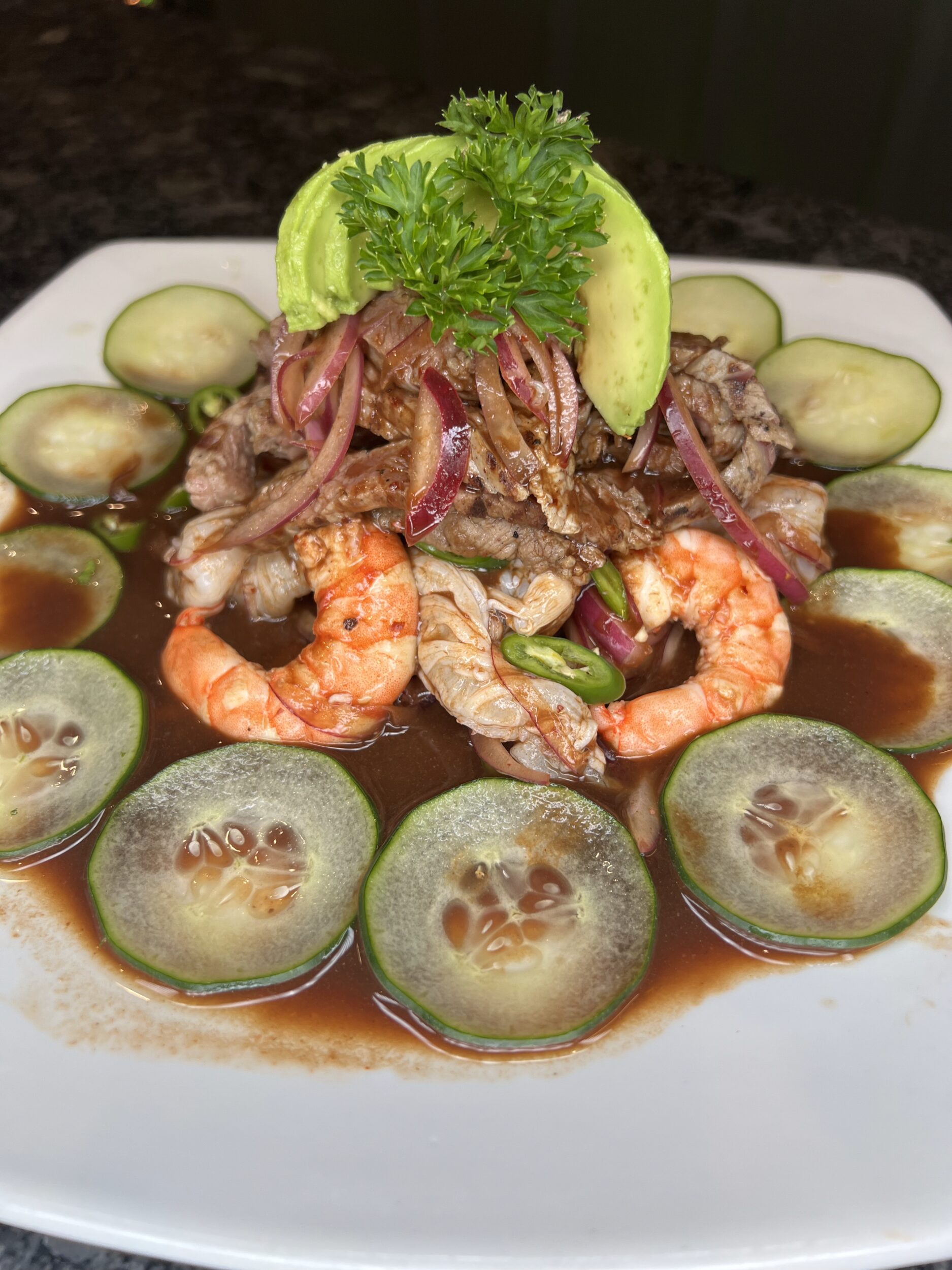 Sirlion Steak, Shrimp and Cooked Shrimp in Lime Juice with black sauce